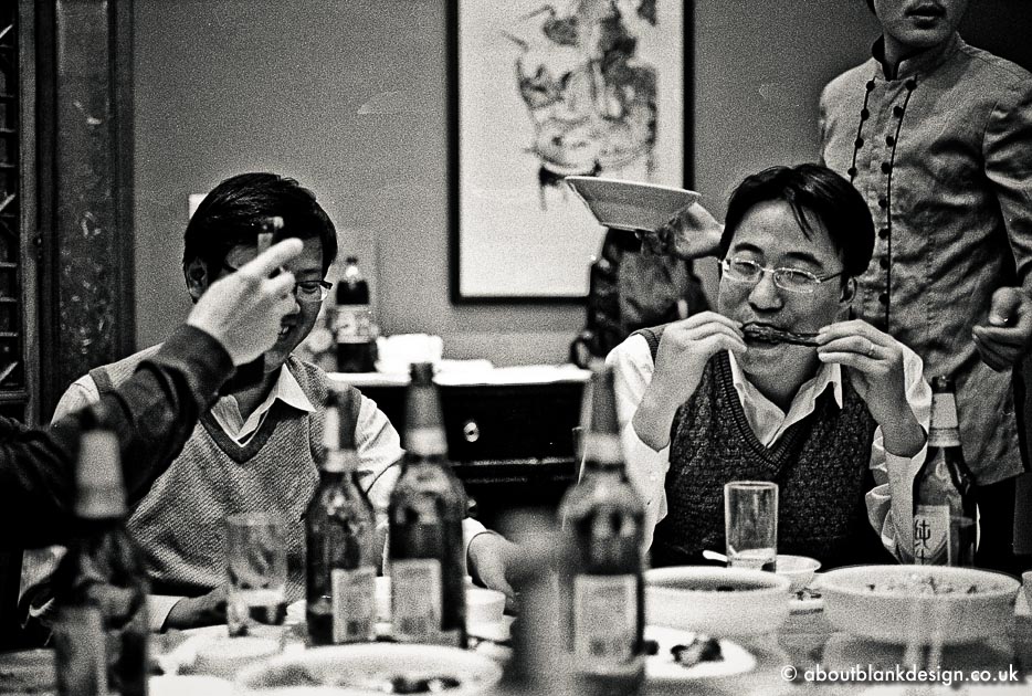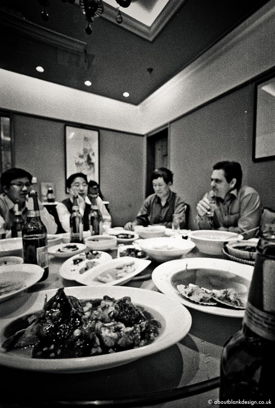 Colleages at dinner. This was awesome. I had chicken feet, they had duck's head, and I was told I ate pig brain. Digestive system overload. Kodak 400TX via Leica M3, 15mm Voigtländer |